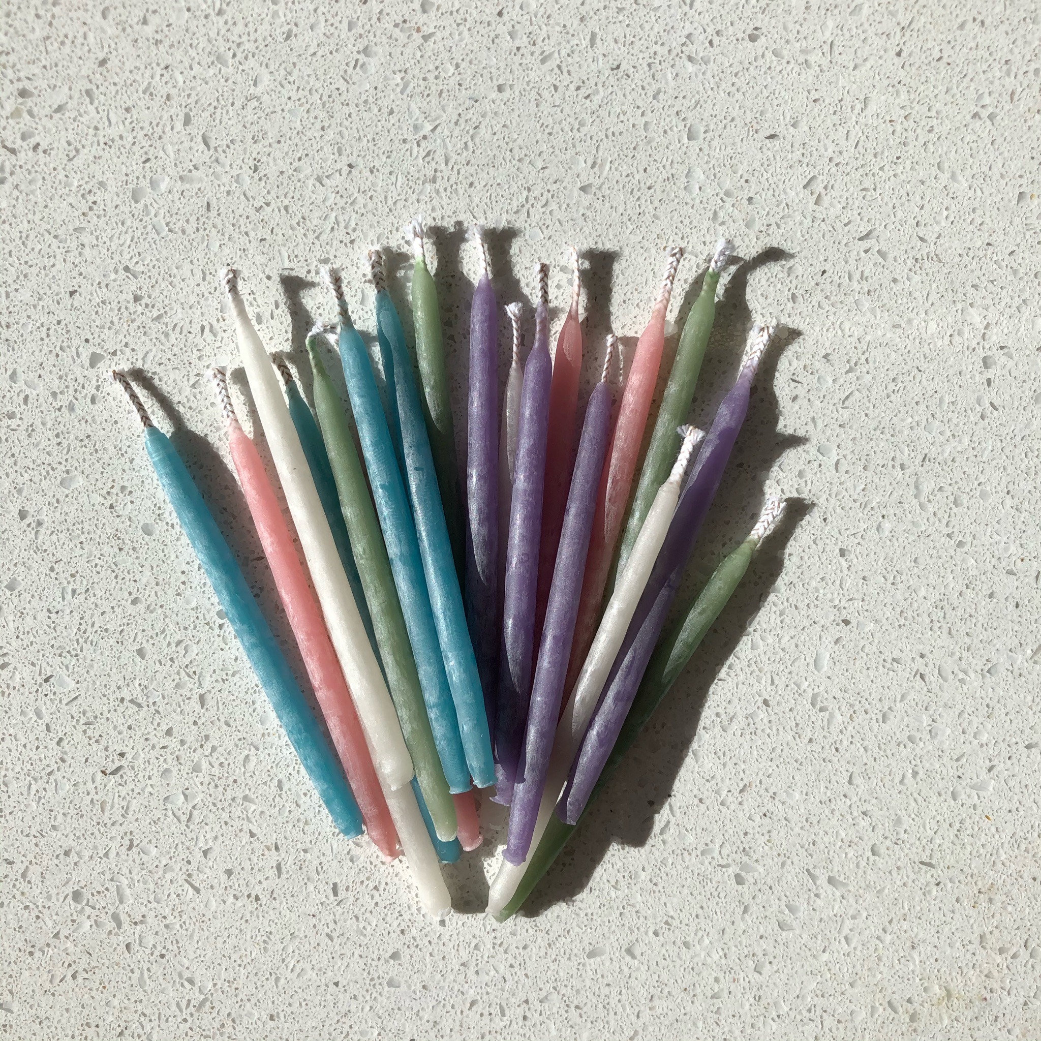 Bougies d’anniversaire en cire d’abeille fait à la main au Canada, confectionnées avec des colorants non toxique et respectueux de l’environnement.