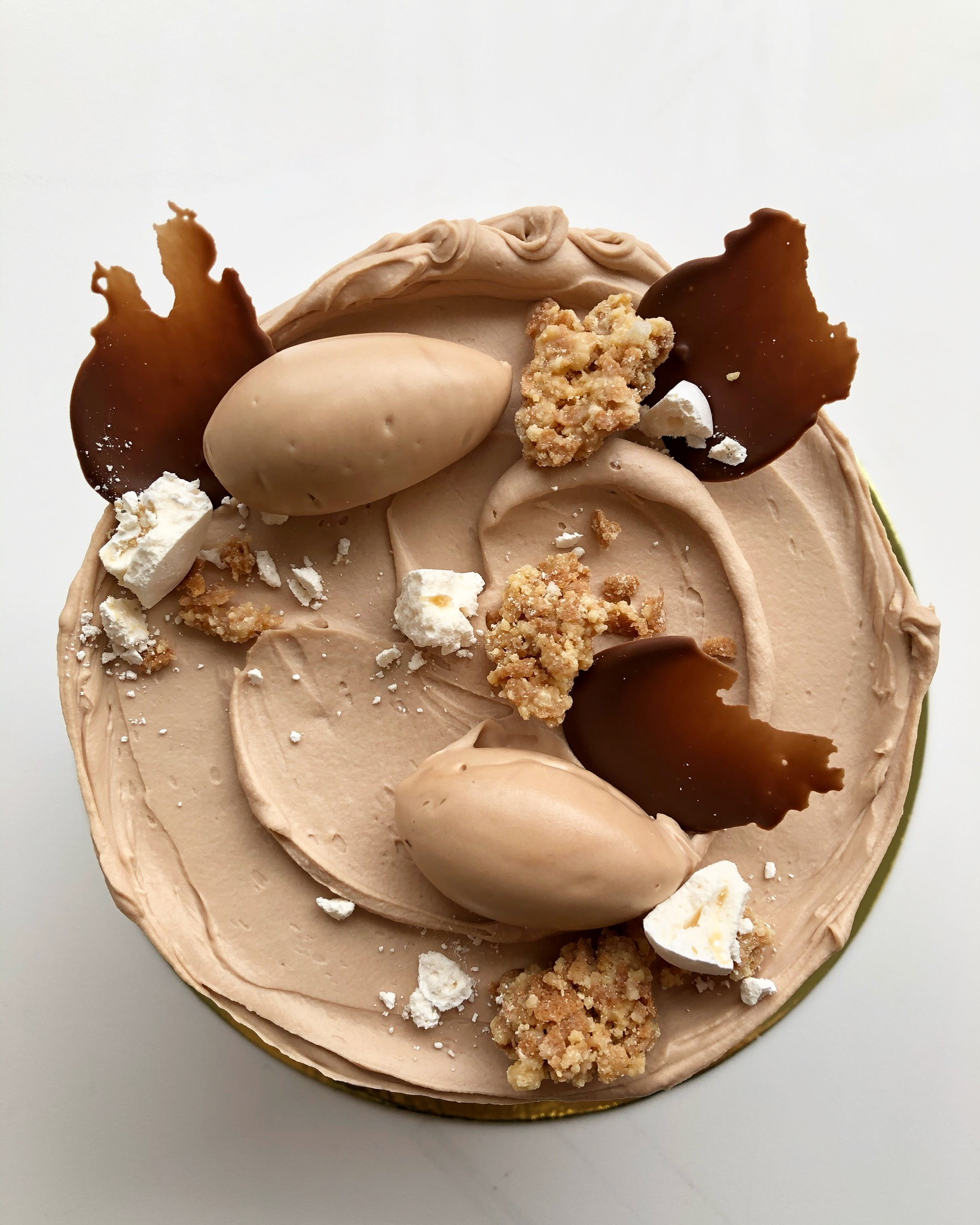 Gâteau chocolat, ganache montée chocolat au lait Alunga, caramel fleur de sel et crumble chocolat blanc & fleur de sel
