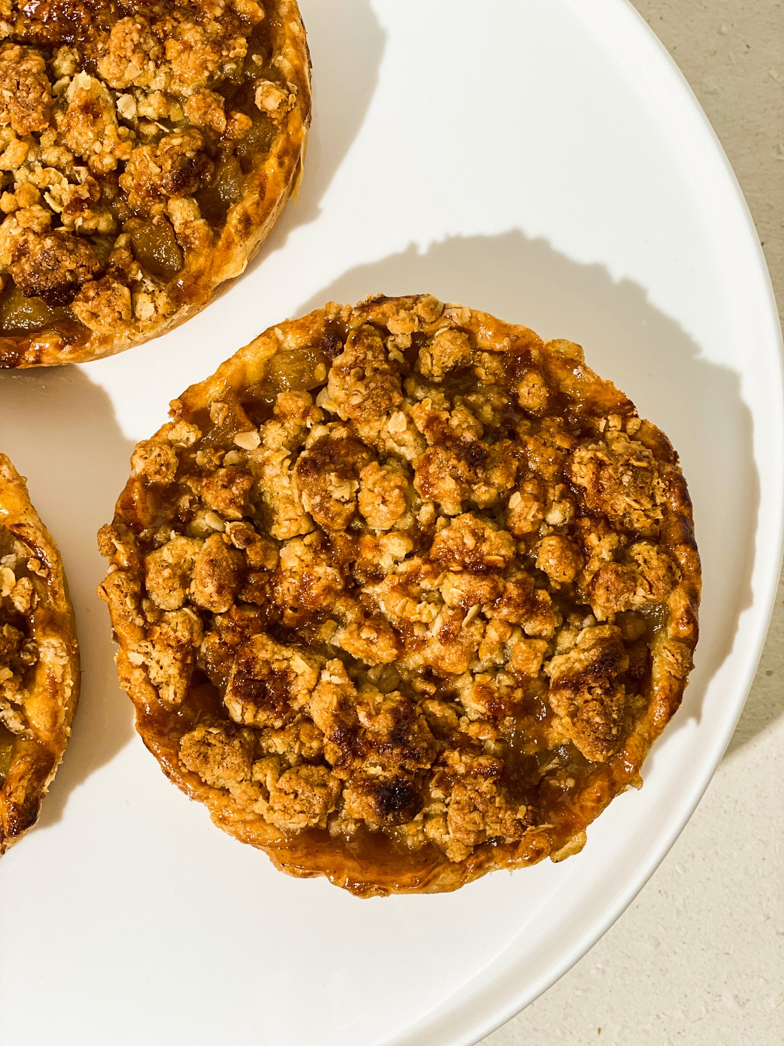 Pâte brisée, poires aux épices, crumble à l’avoine, caramel fleur de sel